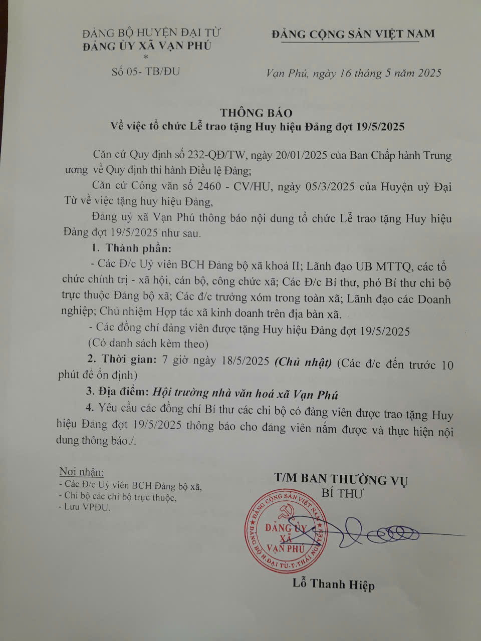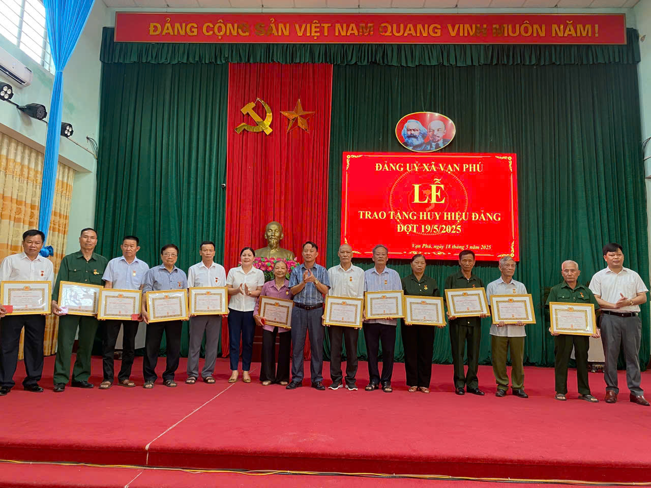 2. Đảng uỷ xã Vạn Phú tổ chức lễ trao huy hiệu đợt 19/5/2025 cho các đảng viên đủ 30 năm; 40 năm; 45 năm; 50 năm; 55 năm và 65 năm tuổi đảng.