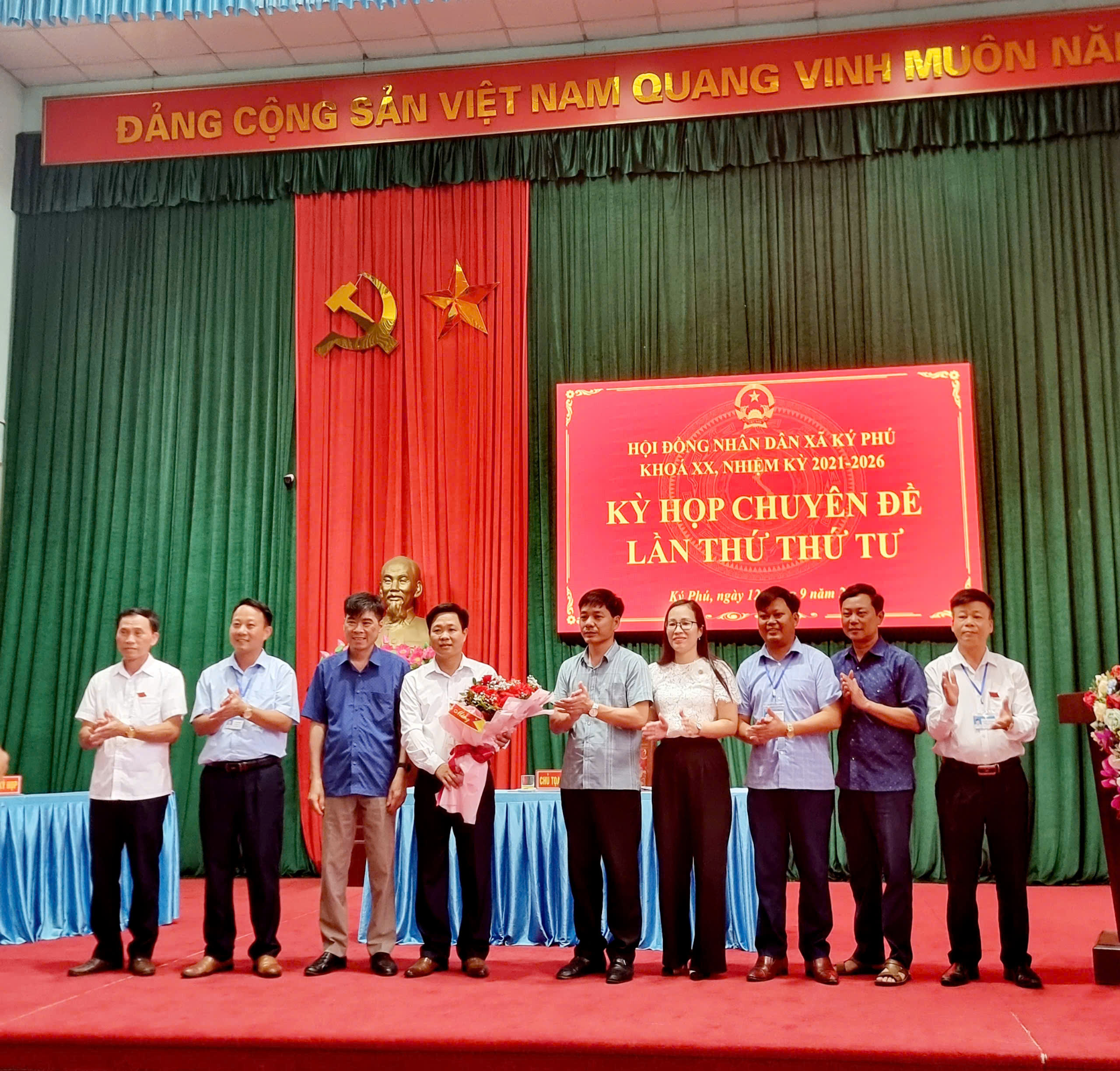 Các đồng chí lãnh đạo HU-HĐND-UBND huyện Đại Từ tham dự kỳ họp; lãnh đạo ĐU-HĐND-UBND Xã Ký Phú tặng hoa chúc mừng đồng chí tân phó chủ tịch UBND xã Ký Phú nhiệm kỳ 2021-2026 đối với đồng chí Dương Đại Hưởng, ủy viên BCH đảng bộ xã.